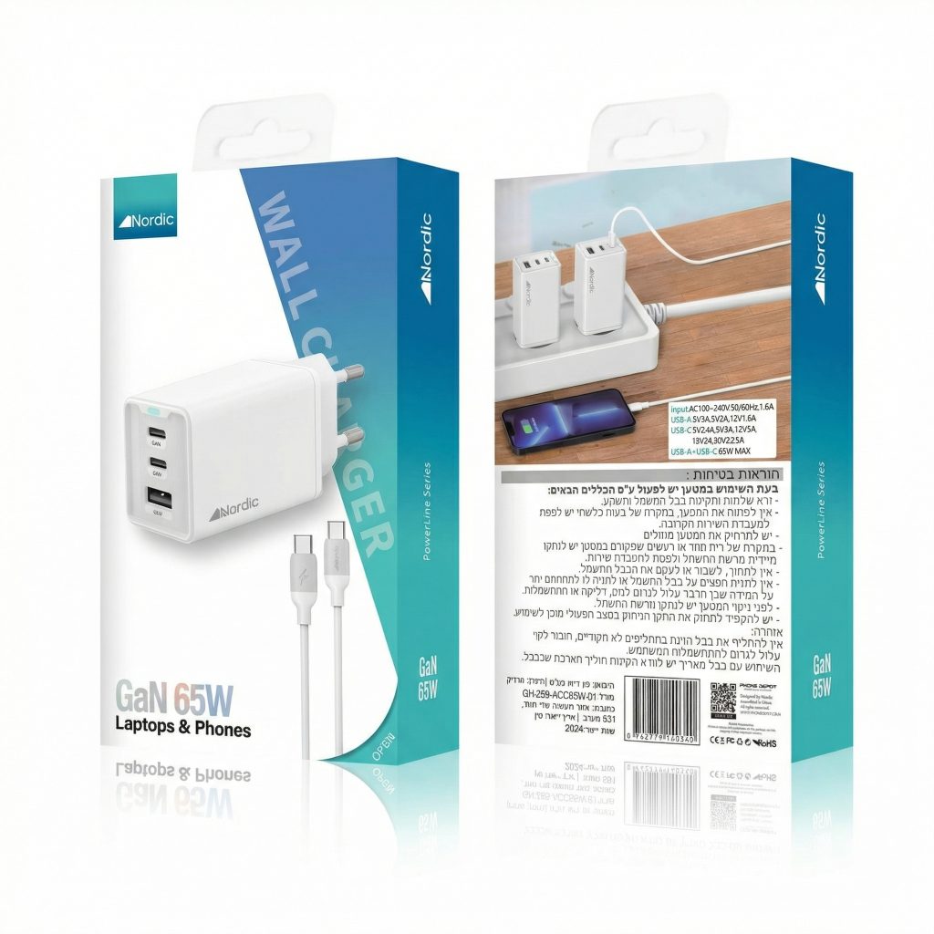 מטען קיר NORDIC GaN PD 65W עם כבל Type-C למחשבים ניידים וטלפונים